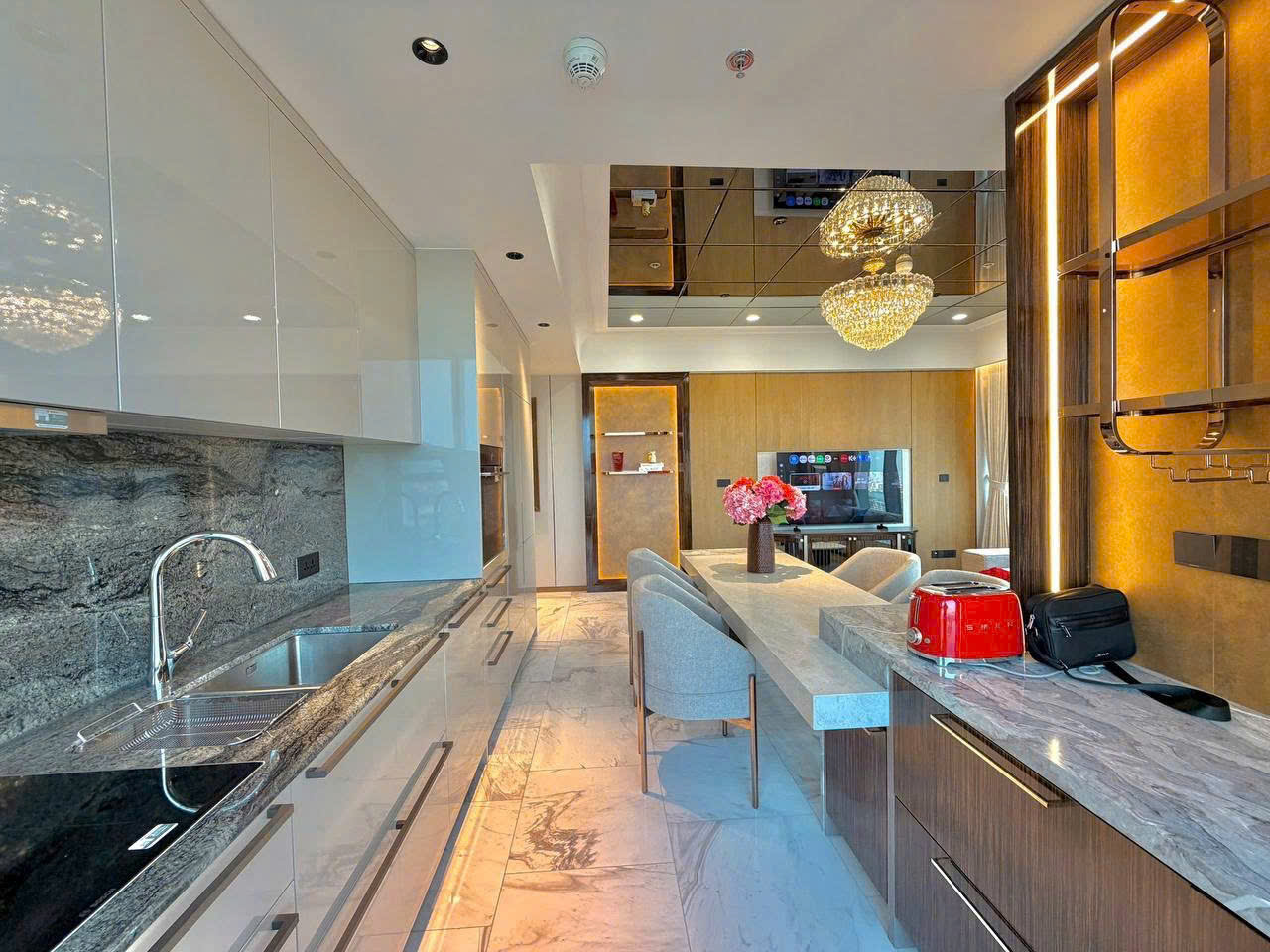 • Khu bếp gọn gàng, thiết bị âm tường hiện đại: lò nướng, bếp từ, máy hút mùi, tủ lạnh