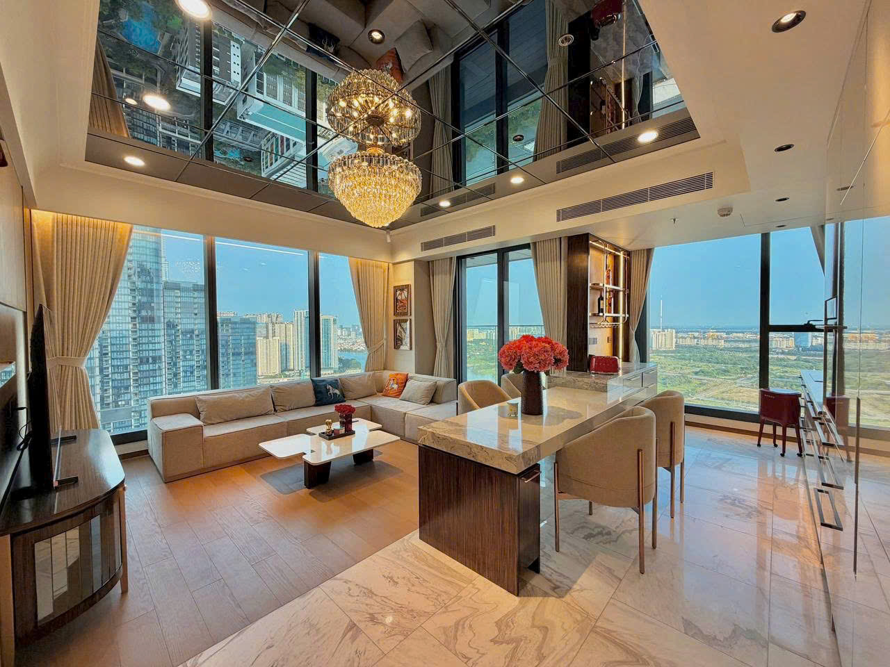 • Phòng khách rộng mở, ánh sáng tự nhiên tràn ngập, kết nối ra ban công view đẹp