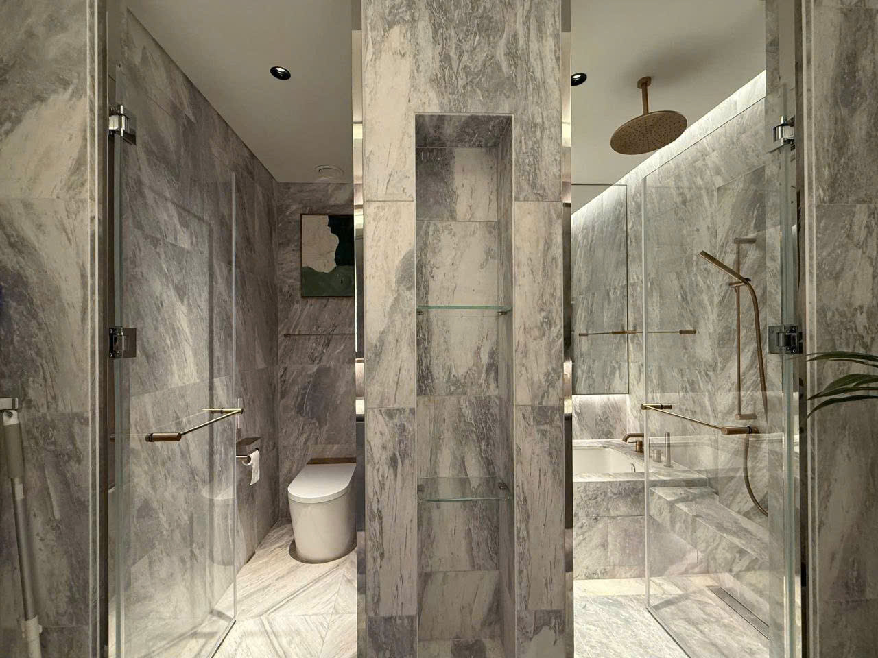 • Toilet hiện đại, lavabo được thiết kế mặt đá Marble tự nhiên, thiết bị vệ sinh nhập khẩu hoàn toàn từ Châu Âu , vách kính tắm đứng