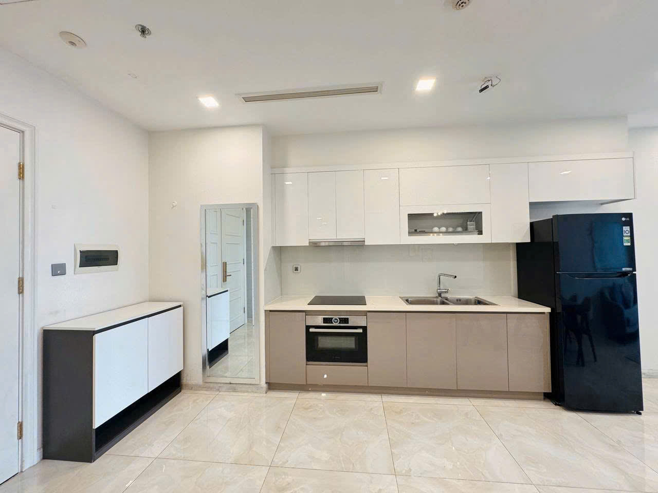 • Khu bếp gọn gàng, thiết bị âm tường hiện đại: lò nướng, bếp từ, máy hút mùi, tủ lạnh