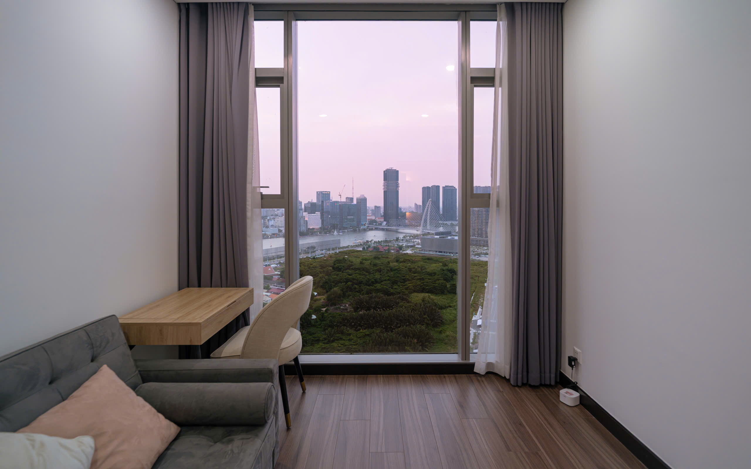 • Phòng ngủ riêng tư, có tủ âm tường lớn, view nhìn ra sông Saigon lung linh về đêm