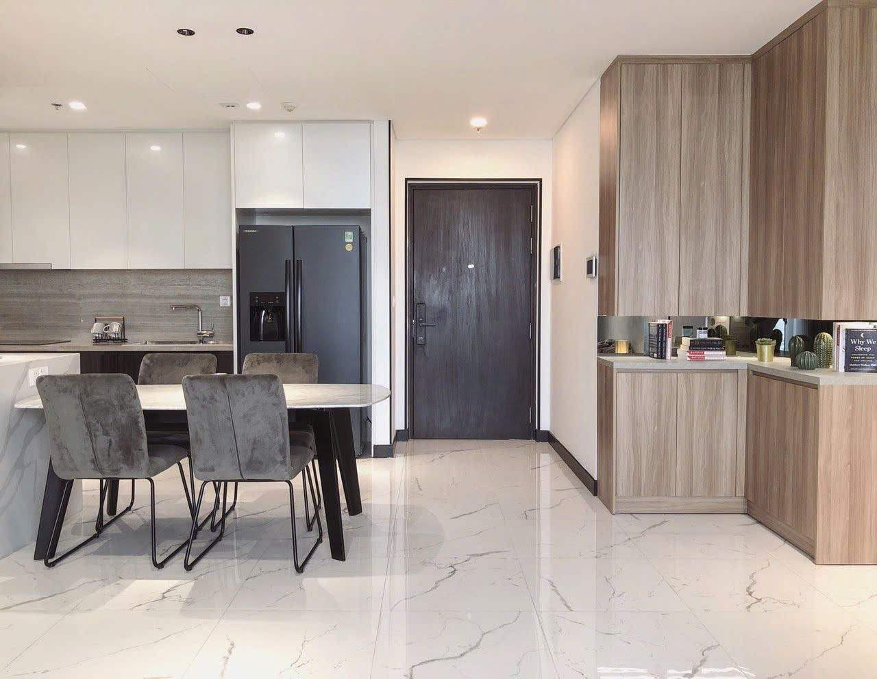 • Khu bếp gọn gàng, thiết bị âm tường hiện đại: lò nướng, bếp từ, máy hút mùi, tủ lạnh