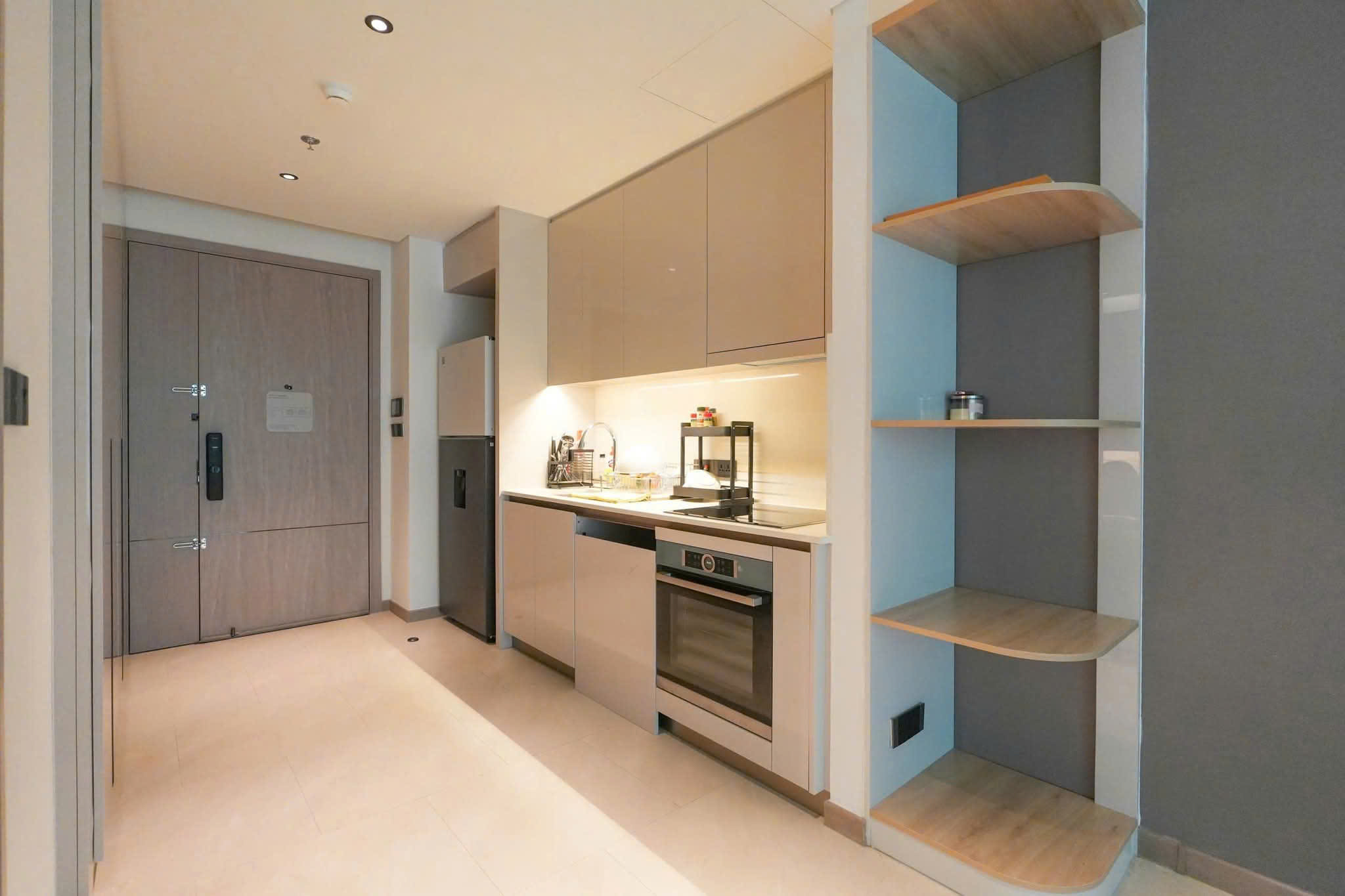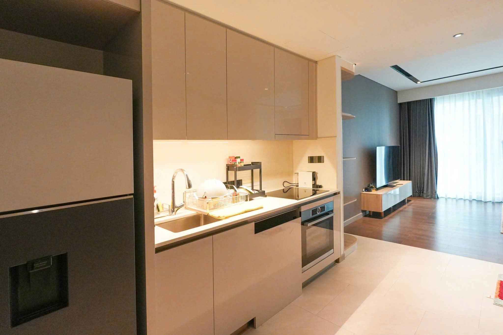 • Khu bếp gọn gàng, thiết bị âm tường hiện đại: lò nướng, bếp từ, máy hút mùi, tủ lạnh