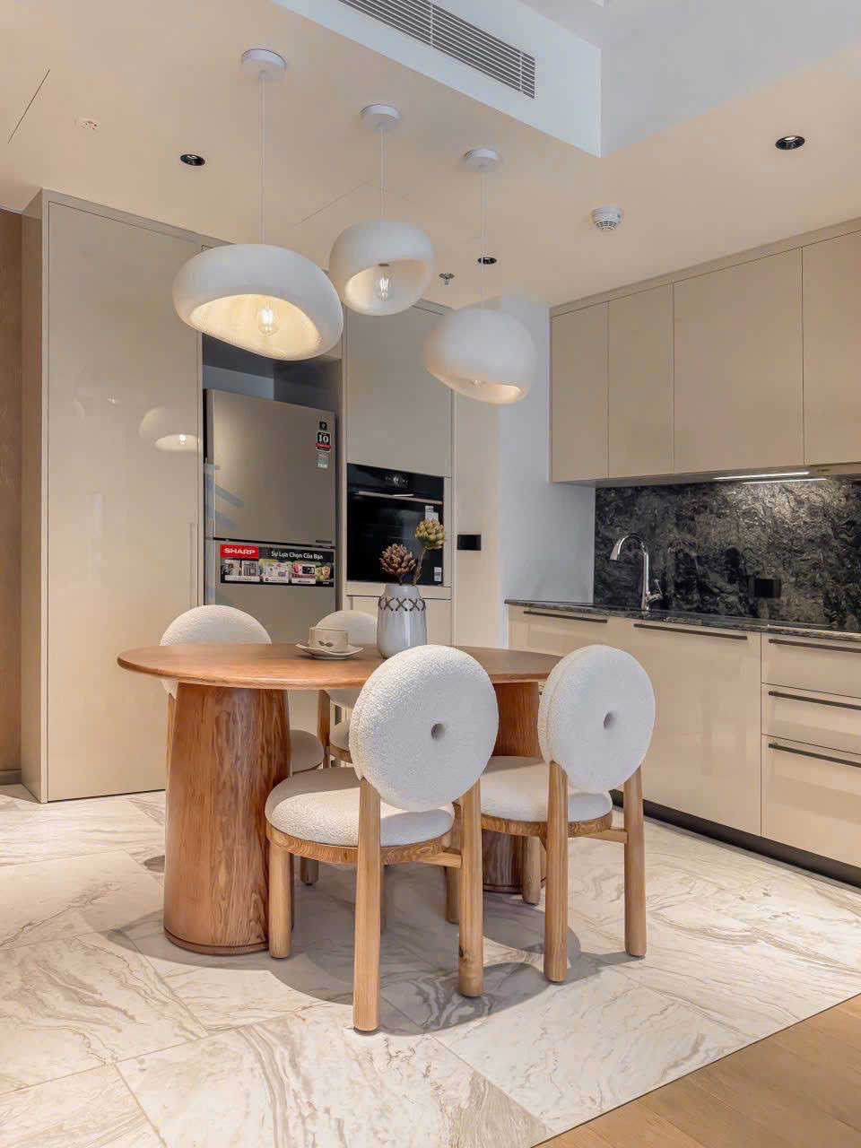 • Khu bếp gọn gàng, thiết bị âm tường hiện đại: lò nướng, bếp từ, máy hút mùi, tủ lạnh