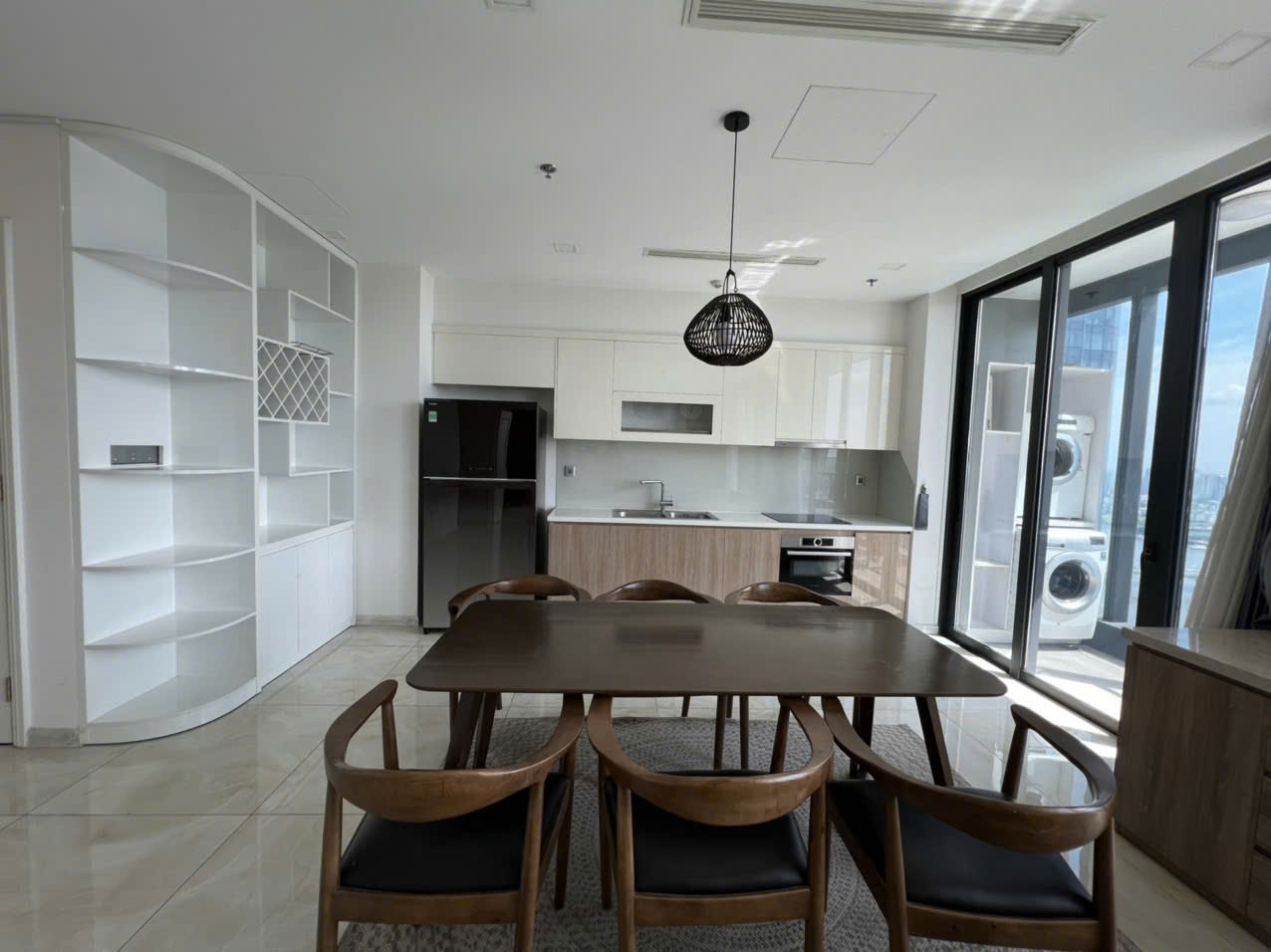 • Khu bếp gọn gàng, thiết bị âm tường hiện đại: lò nướng, bếp từ, máy hút mùi, tủ lạnh