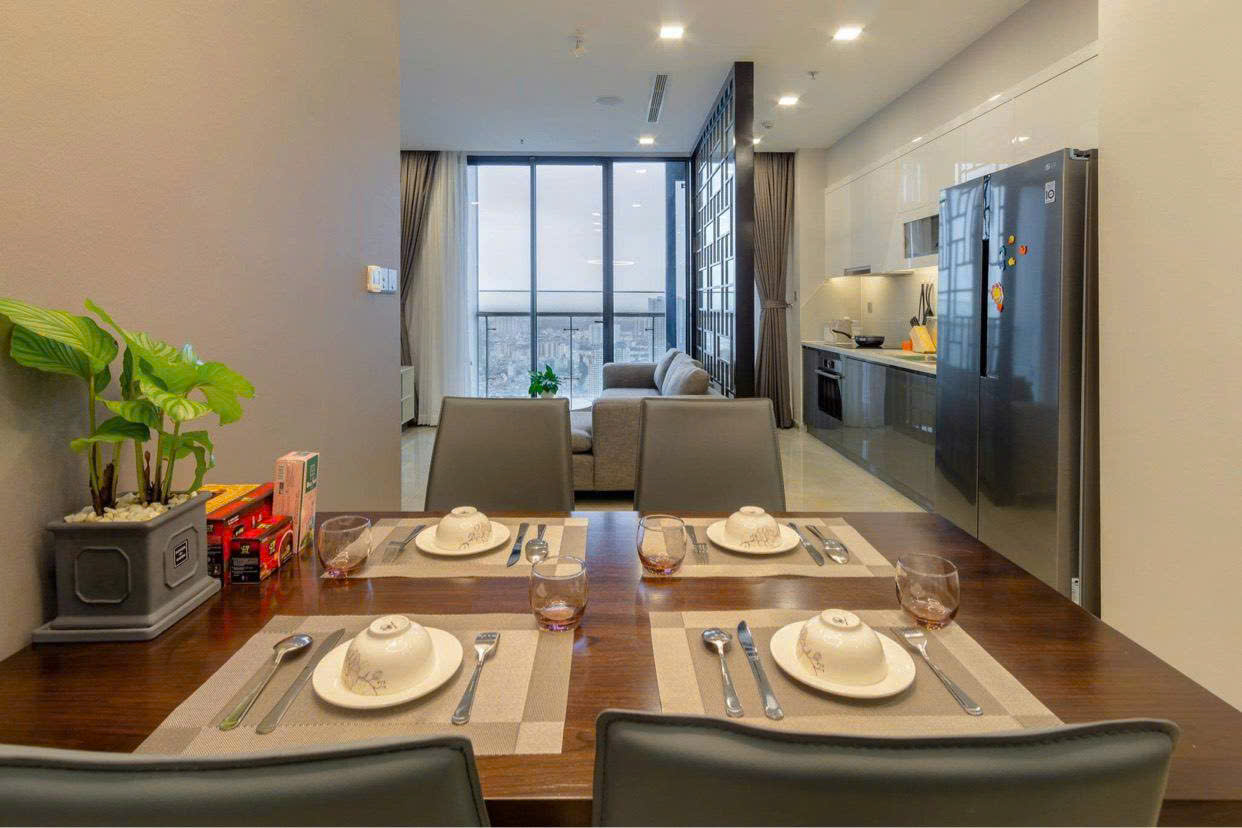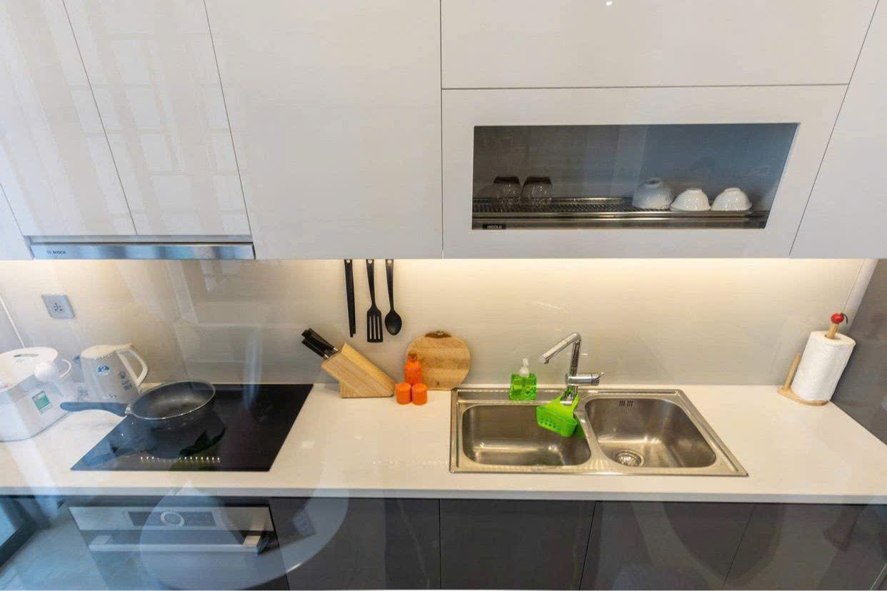 • Khu bếp gọn gàng, thiết bị âm tường hiện đại: lò nướng, bếp từ, máy hút mùi, tủ lạnh