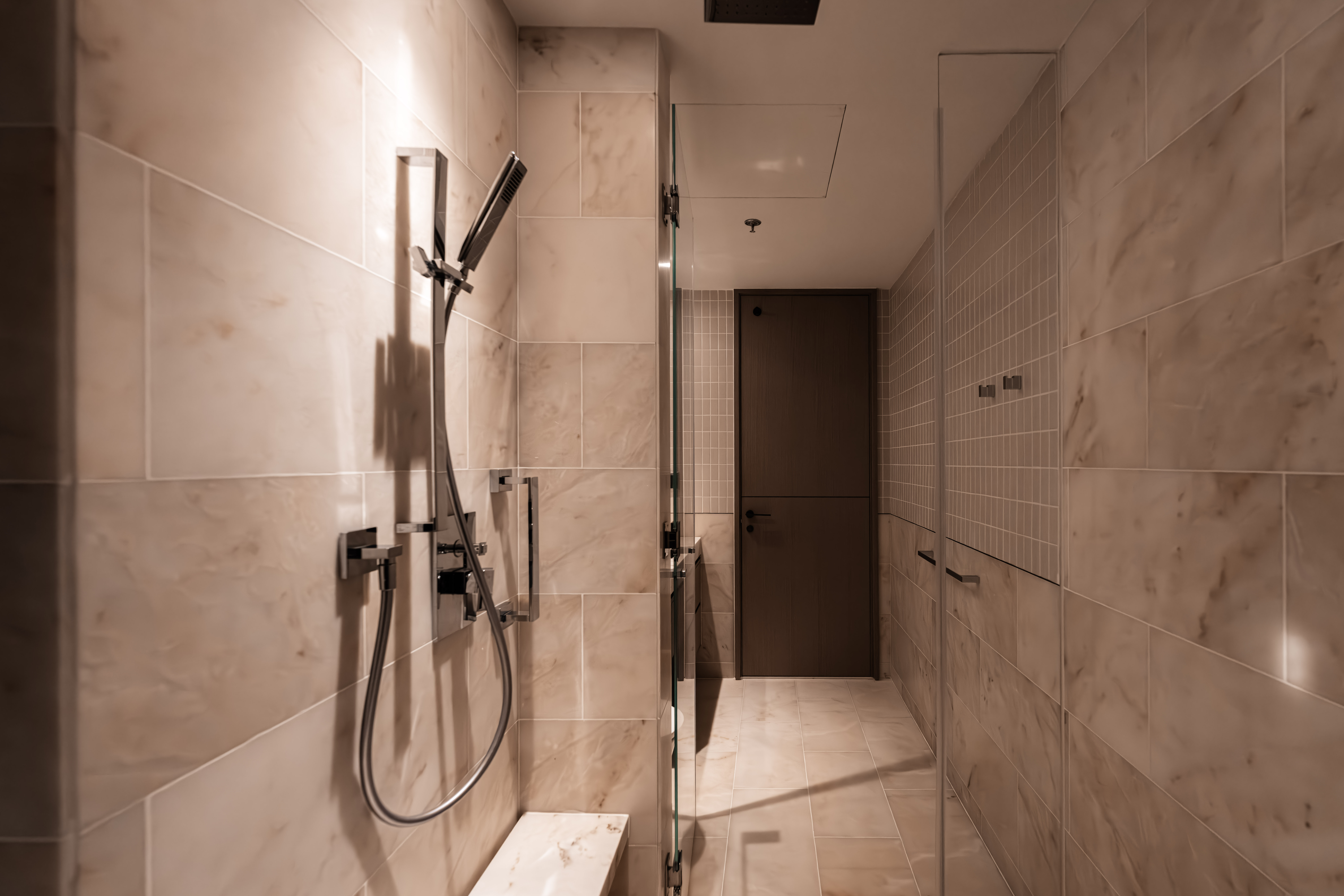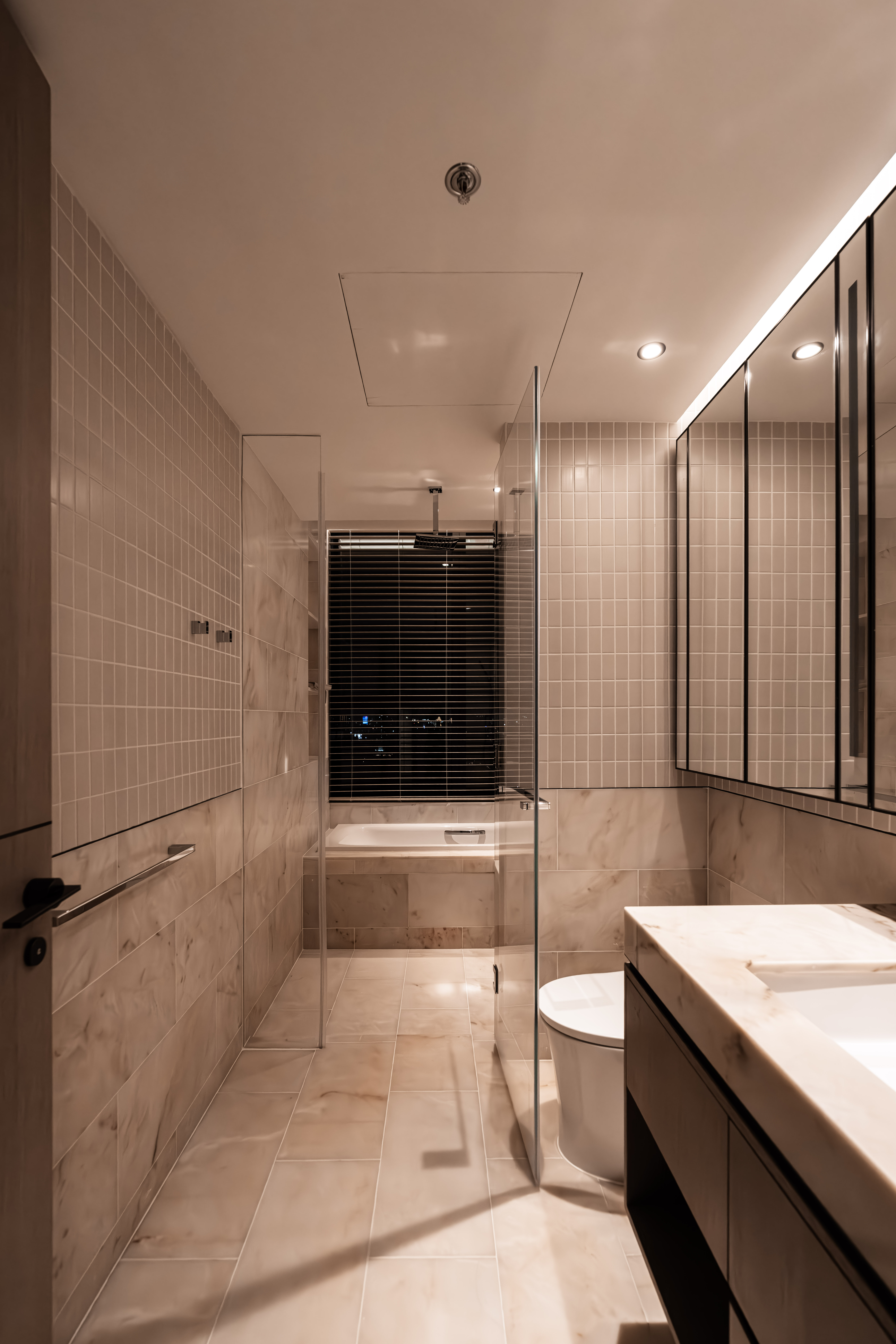 • Toilet hiện đại, lavabo được thiết kế mặt đá Marble tự nhiên, thiết bị vệ sinh nhập khẩu hoàn toàn từ Châu Âu , vách kính tắm đứng