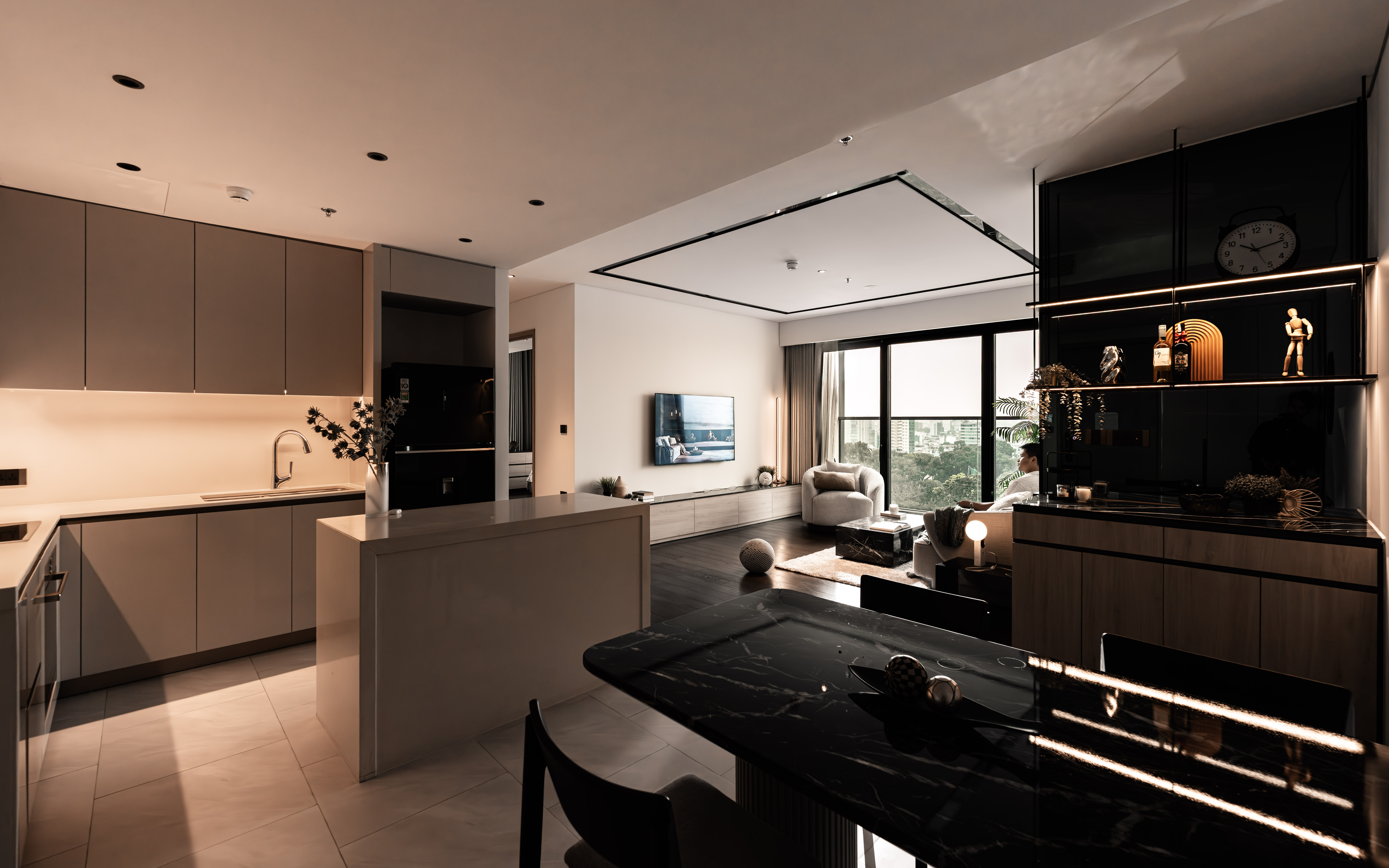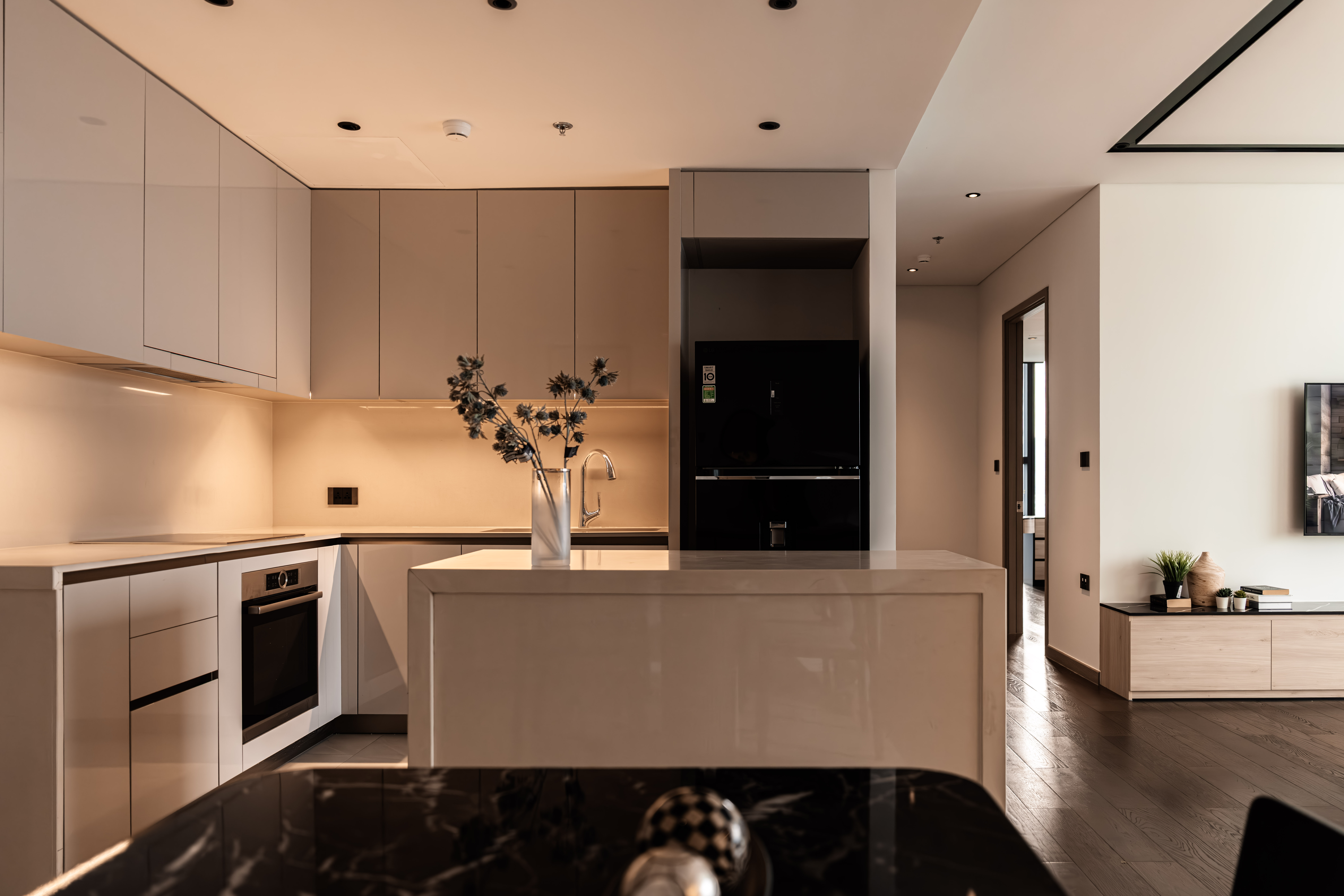 • Khu bếp gọn gàng, thiết bị âm tường hiện đại: lò nướng, bếp từ, máy hút mùi, tủ lạnh
