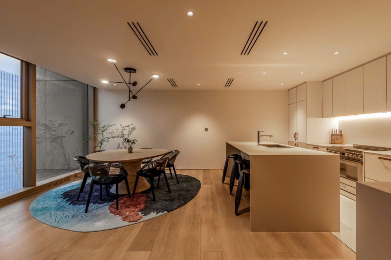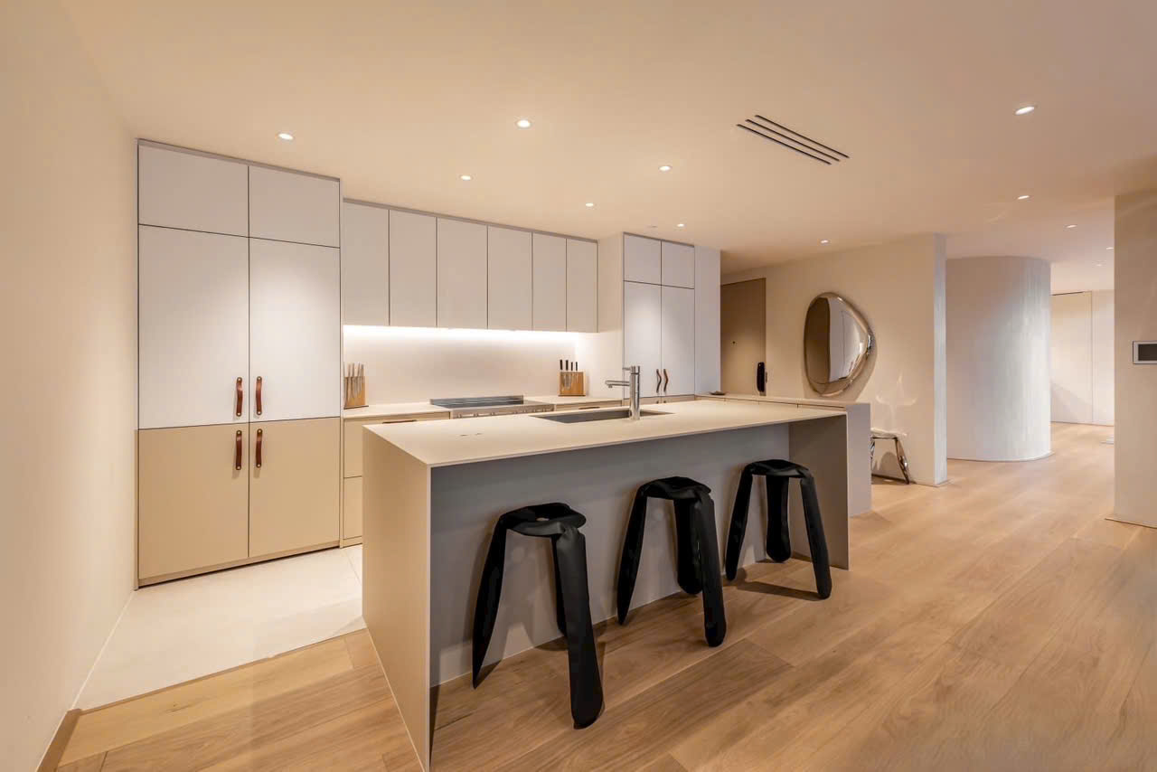 • Khu bếp gọn gàng, thiết bị âm tường hiện đại: lò nướng, bếp từ, máy hút mùi, tủ lạnh