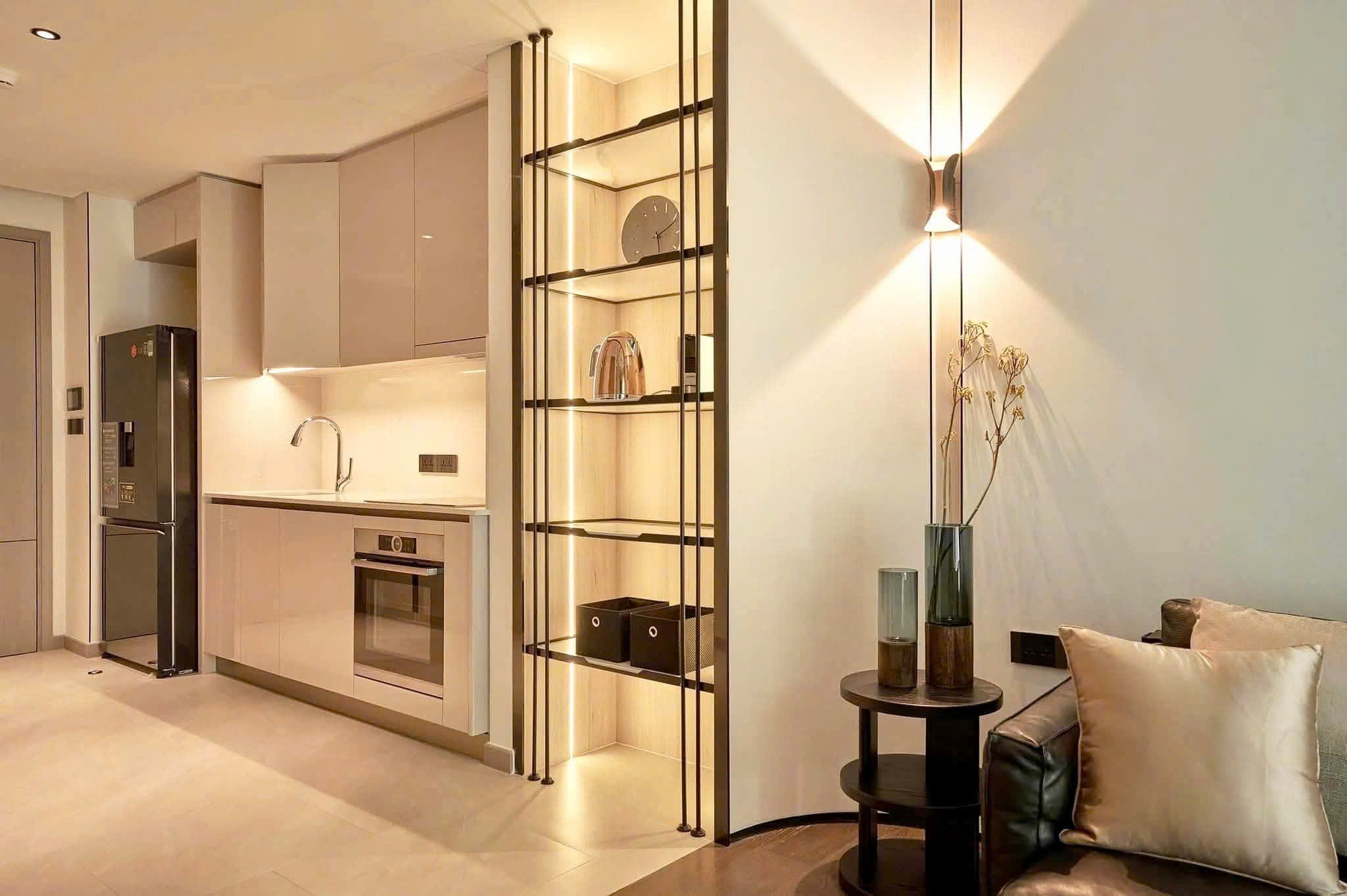 • Khu bếp gọn gàng, thiết bị âm tường hiện đại: lò nướng, bếp từ, máy hút mùi, tủ lạnh