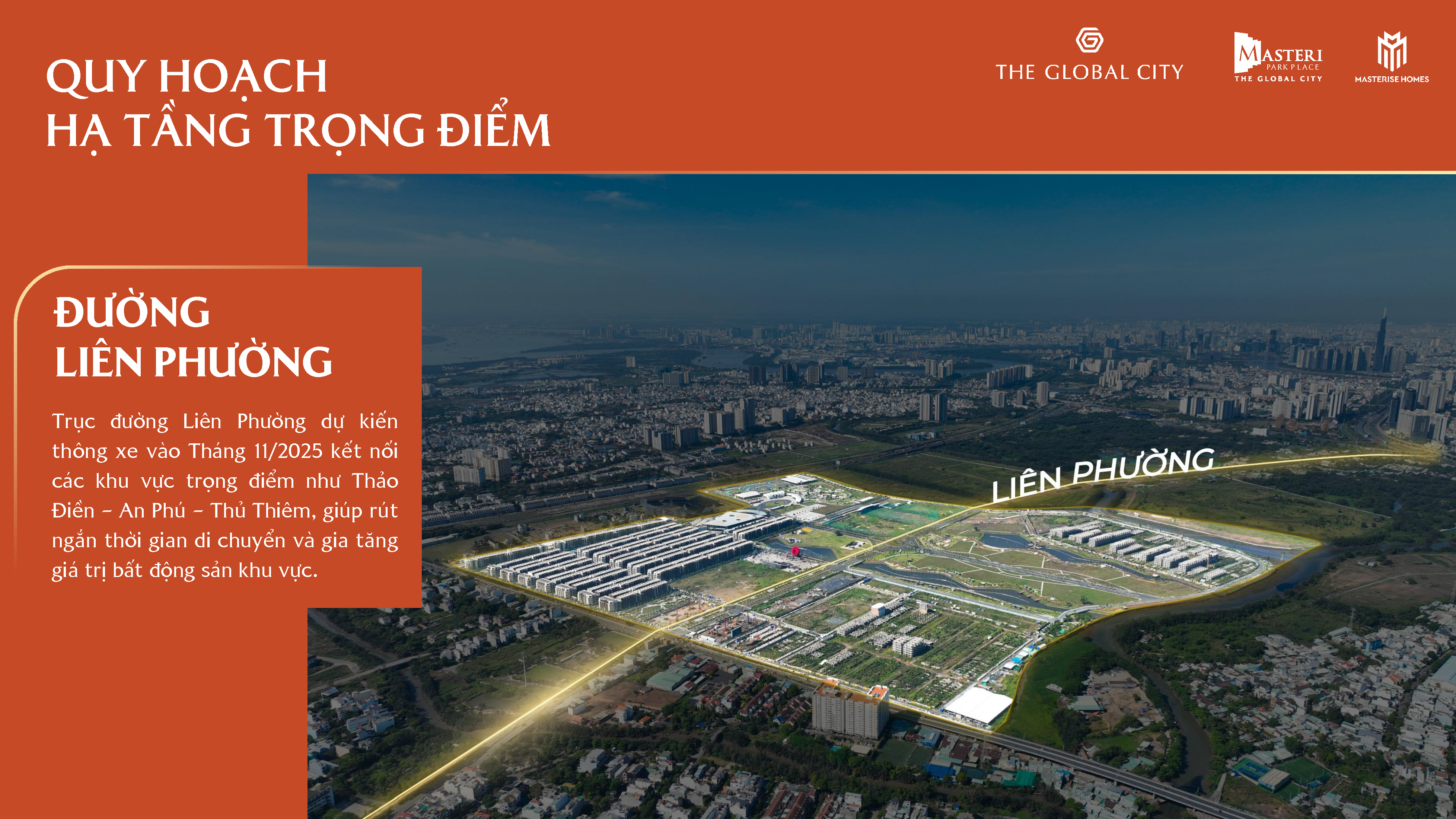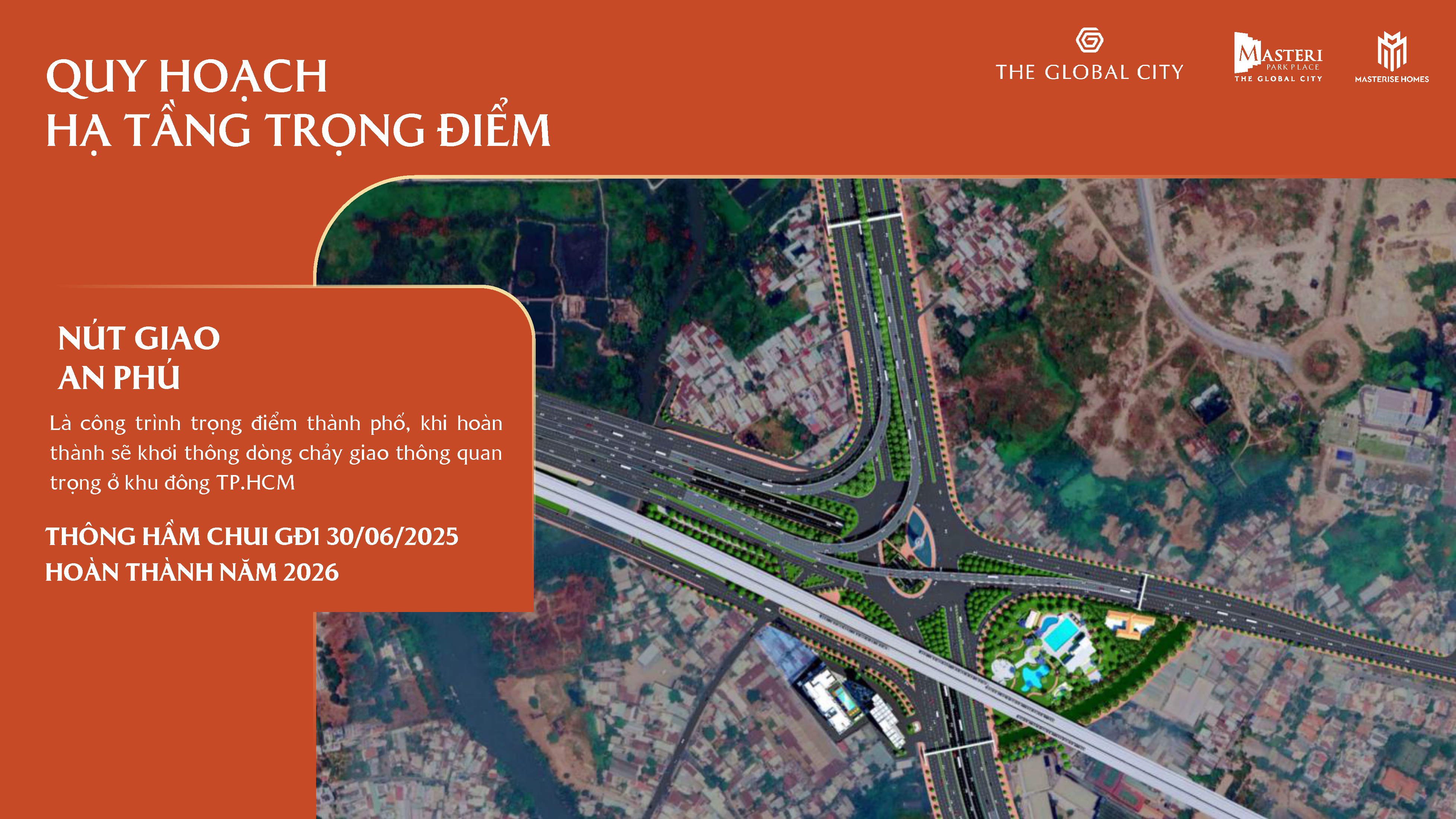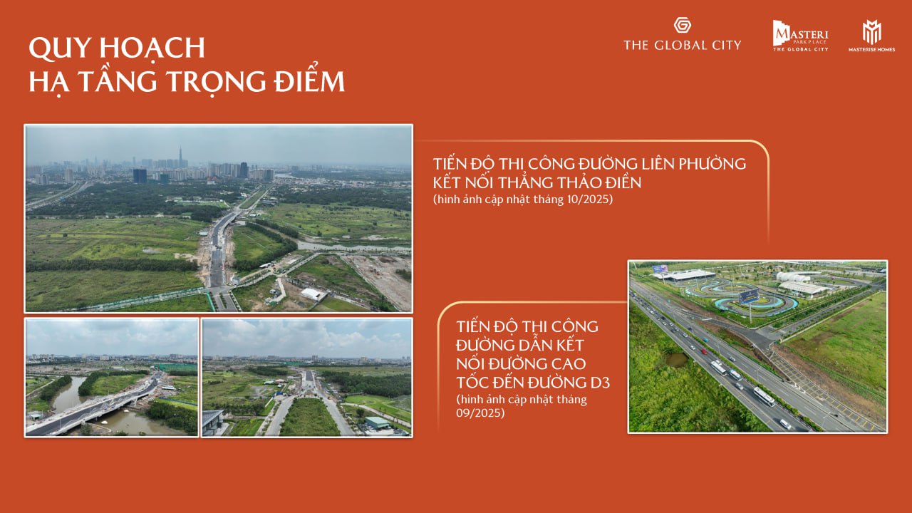 Tọa lạc tại trung tâm đại đô thị The Global City, Masteri Park Place thừa hưởng lợi thế vượt trội từ hệ thống hạ tầng đồng bộ khu Đông. Nơi đây nằm trên các tuyến giao thông huyết mạch, kết nối linh hoạt với những đầu mối giao thông công cộng quan trọng, giúp cư dân dễ dàng di chuyển đến các khu vực kinh tế – chính trị trọng yếu của TP. Hồ Chí Minh.
